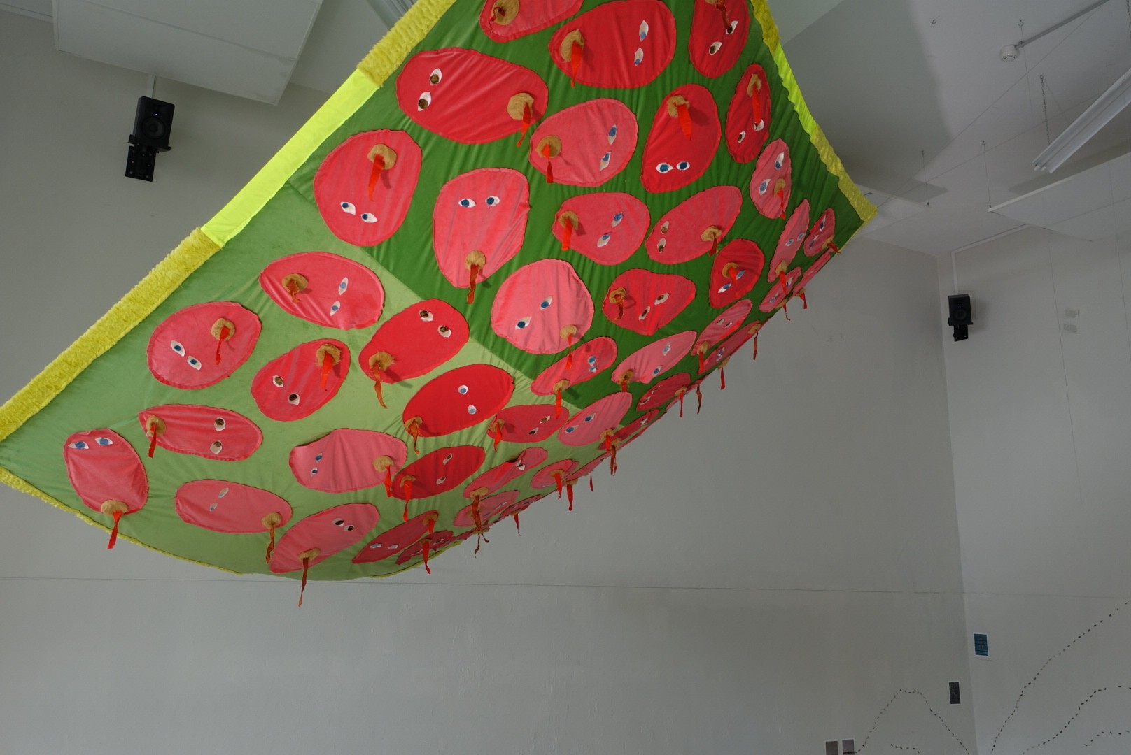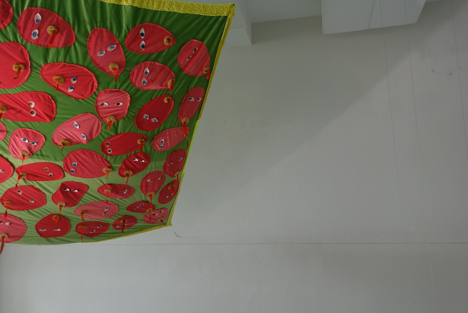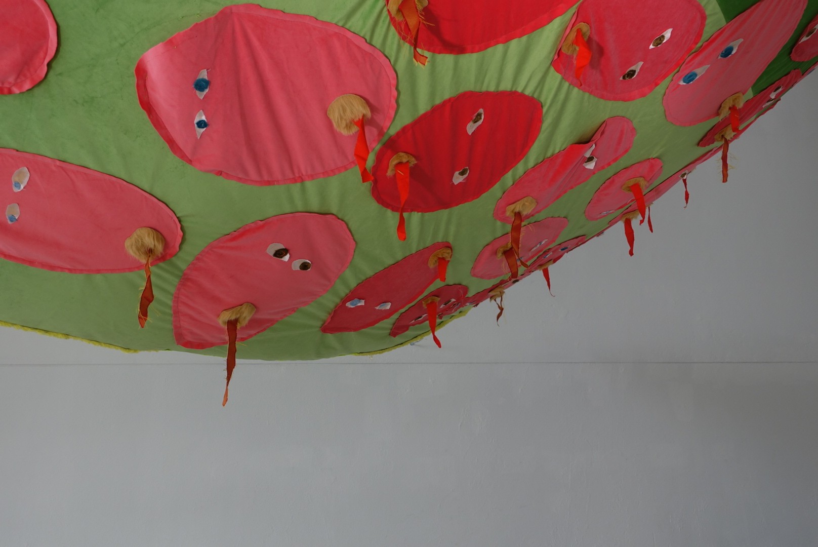 “All the works were created within the project proposed by Colectivo Paralaxe, “Boca Aberta” (Open Mouth). The four pieces investigate the cycle of life and death. XIII is a large picnic towel. A Face, a Spell and Two Hands Will Swallow an Enormous Heart is a double piece, hanging on the wall with both parts placed side by side. Contemplation of a Circle and a Cat in the Afterlife is a floor piece. The opening of the collective exhibition was also accompanied by the publication of a book containing a series of drawings that function as a manual for self-healing through a volcano (on mourning).”