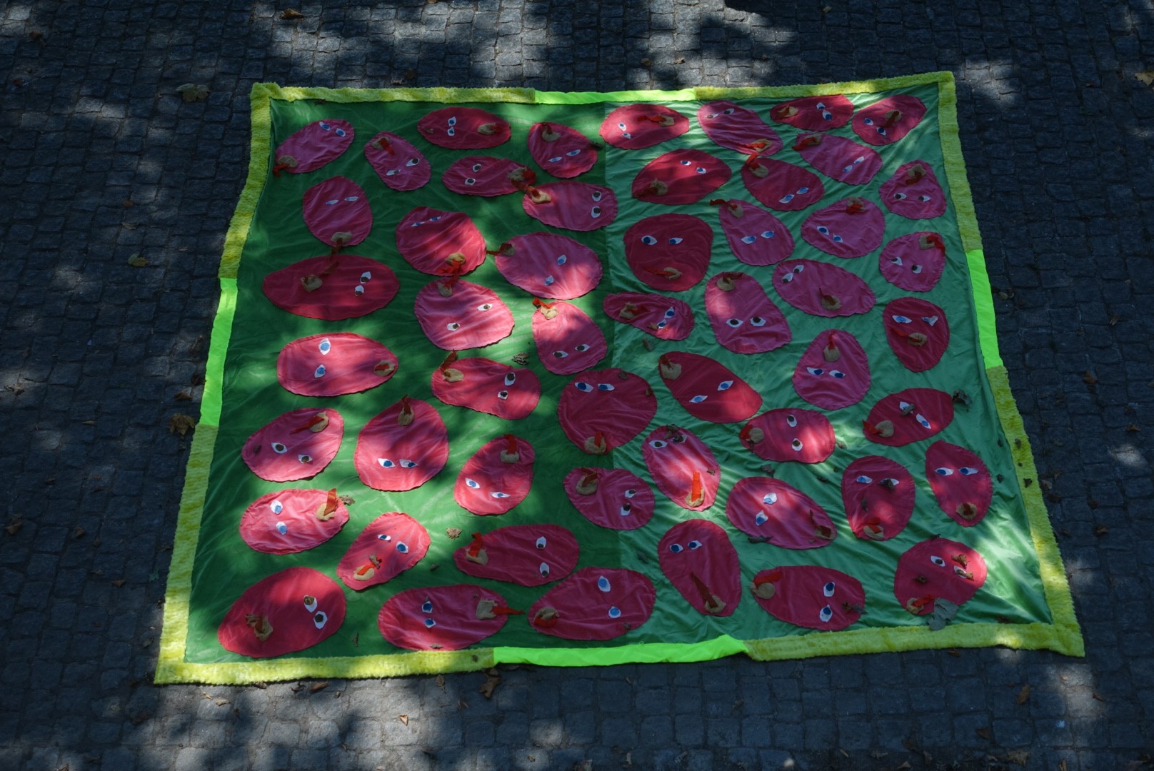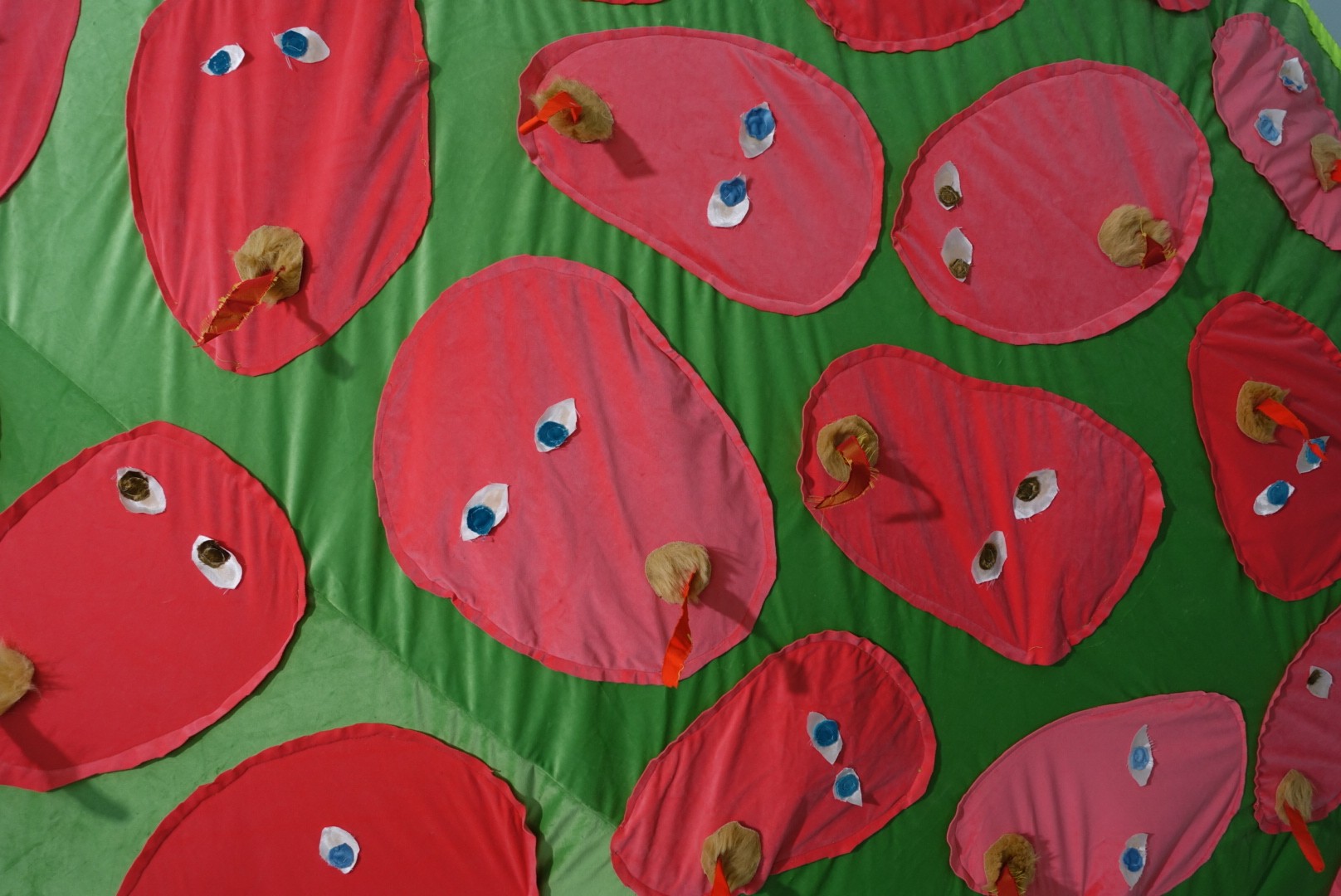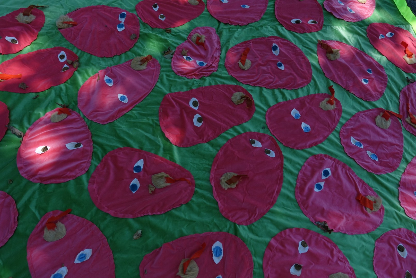 “All the works were created within the project proposed by Colectivo Paralaxe, “Boca Aberta” (Open Mouth). The four pieces investigate the cycle of life and death. XIII is a large picnic towel. A Face, a Spell and Two Hands Will Swallow an Enormous Heart is a double piece, hanging on the wall with both parts placed side by side. Contemplation of a Circle and a Cat in the Afterlife is a floor piece. The opening of the collective exhibition was also accompanied by the publication of a book containing a series of drawings that function as a manual for self-healing through a volcano (on mourning).”
